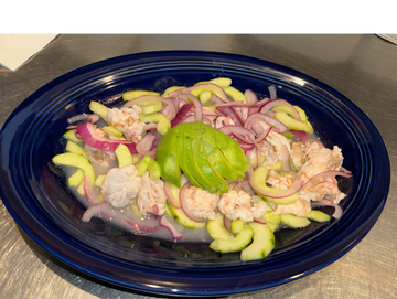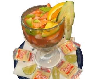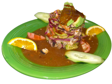 Tower-shaped, sinaloa-style mixed seafood dish.