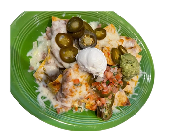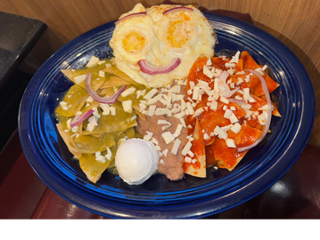 Corn tortilla chips covered in green and red sauce. Topped with an Egg/ Avocado/ Cheese/ Onion/ Sour Cream